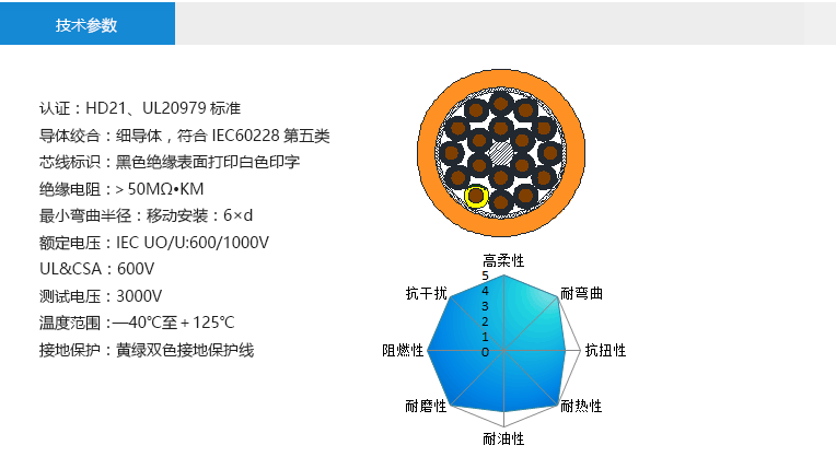 良好的耐折彎,抗扭曲;超高的柔性和使用壽命;可接觸各類含礦物油成分的潤滑劑、稀釋劑、堿水溶液及其他化學介質;具備優異的耐候性、耐磨性、耐油性; 適用于工業機器人;