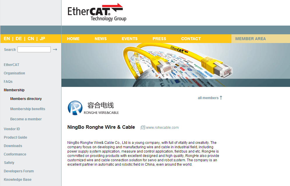 基于公司對于技術的不斷投入和精益求精,在經過EtherCAT技術協會嚴格審核后,在2016年2月,寧波容合電線有限公司成功加入EtherCAT協會。